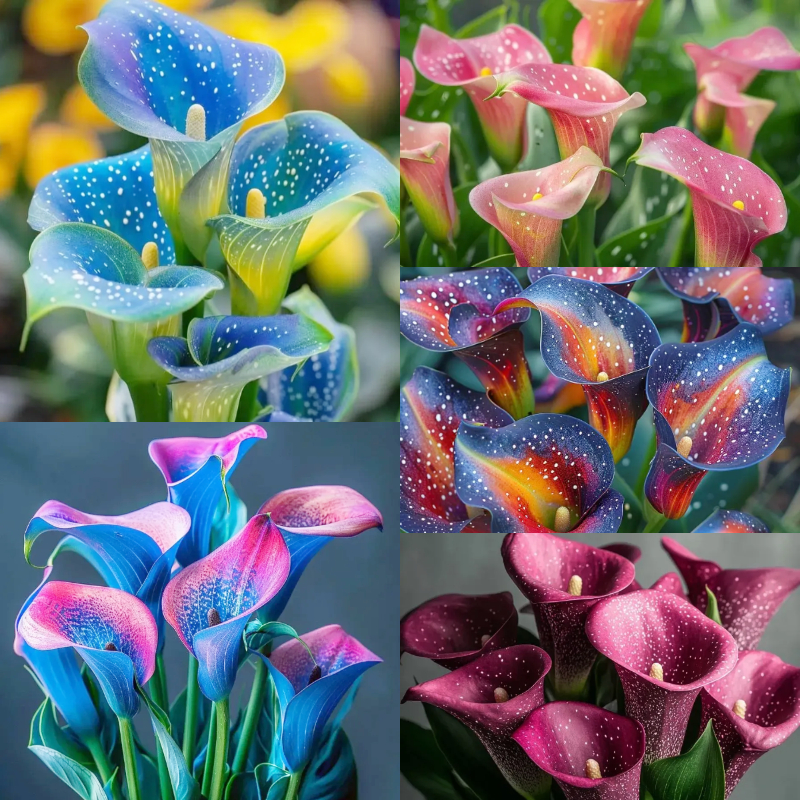 Looking to add a splash of vibrant color to your garden or home? The Aurora Calla (Zantedeschia 'Rainbow') is the perfect choice! With its stunning blooms that transition from deep blues and purples to striking pinks, oranges, and yellows, this flower is truly a visual masterpiece. Each petal unfolds to reveal a gradient of breathtaking hues, creating a kaleidoscope of colors that’s sure to capture attention.
