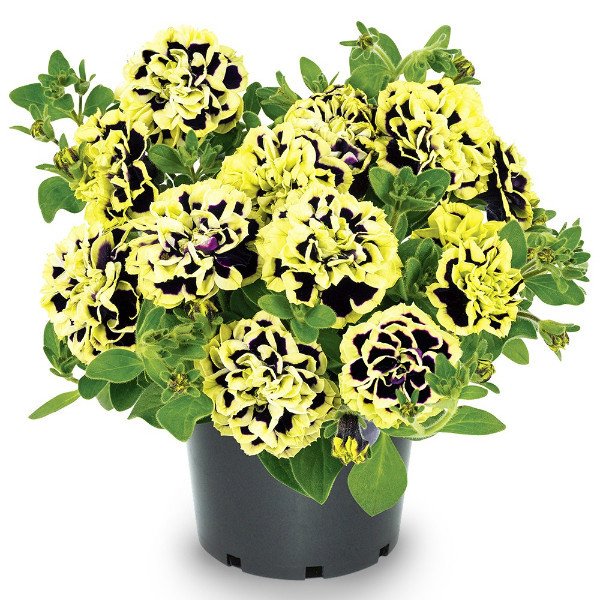 The double petunia Mystical is a new dream variety that will become an eye-catcher in your balcony planting! The multi-double, two-tone petunia flowers are amazing! The unique flower color plays throughout the summer, intensifying from yellow with a purple center to purple with a golden yellow edge! The double petunia Mystical (Petunia grandiflora) is a very floriferous and robust top variety that lasts until late summer and produces masses of large flowers. With its semi-trailing, beautifully branched growth, it is perfect for tubs, hanging baskets and window boxes, where it creates a veritable sea of flowers.